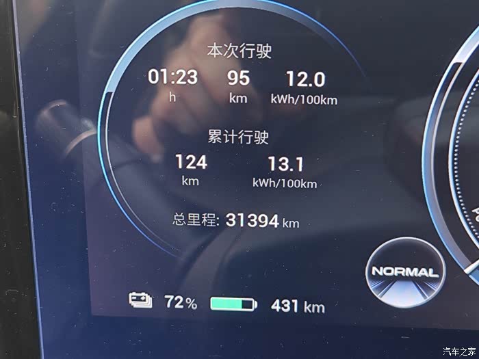 本次测试总行程95公里,用时1小时25分钟,表显能耗12KWh/100km。表显续航里程正好掉了100公里。续航达成率为95%。