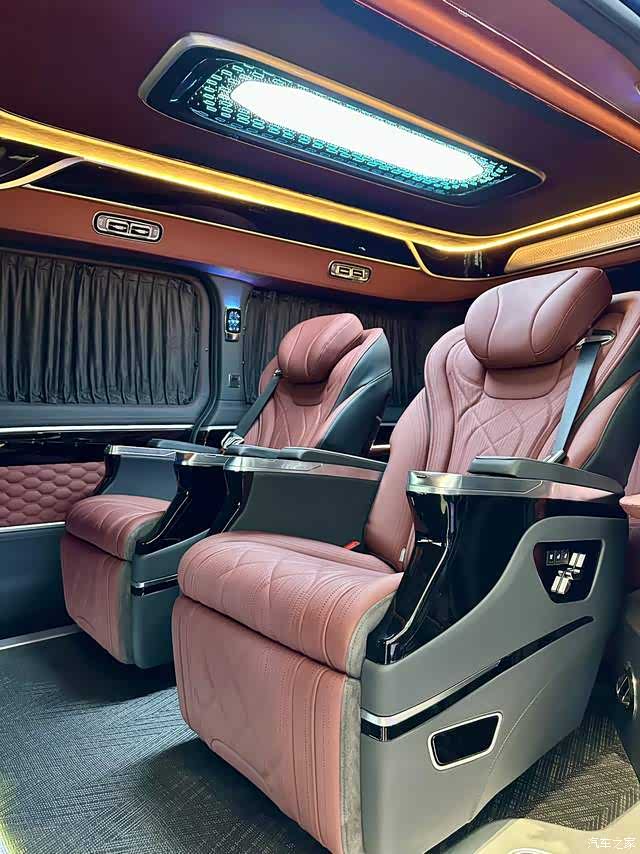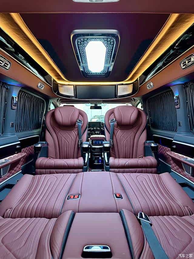 新款宽大航空座椅,铁和铝框架一体冲压成型,安全可靠,支撑性和舒适性极佳。座椅通风加热、五种按摩方式、悬浮零重力模式,还有前后滑动、靠背倾斜、腿托伸缩等多项调节功能,满足不同乘客需求。中排航空座椅可旋转,与三排对坐,搭配小桌板,三排沙发床还能一键放倒,商务洽谈、长途旅行都惬意。大横屏网络吊顶电视,让你随时享受丰富娱乐体验 。中控台线条流畅,与波尔多红内饰相得益彰,布局合理,功能按键触手可及,大尺寸显示屏集成导航、多媒体娱乐等多种功能,为驾驶者提供全方位便利。