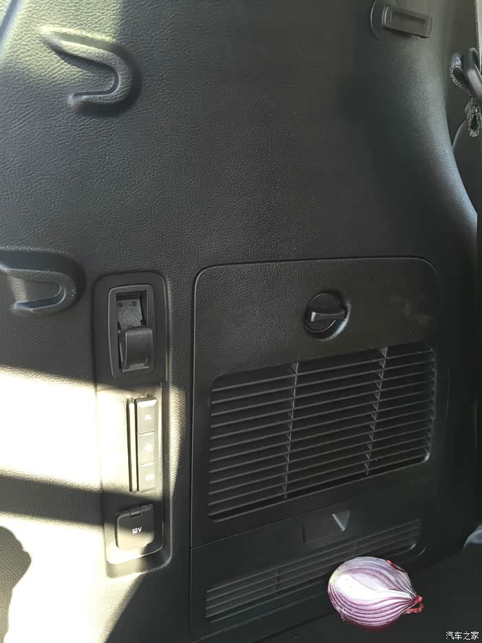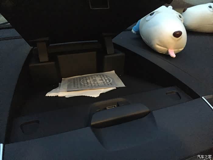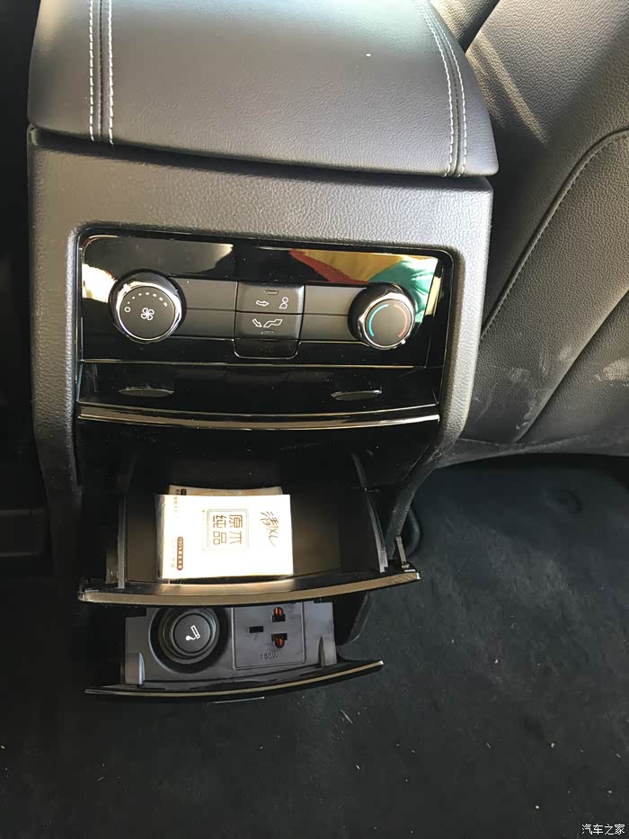 二排中间,空调调节按钮,储物格,还有12v和220v电源插口,实用,大赞。