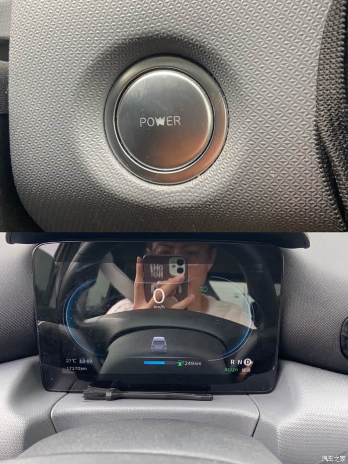 踩下制动踏板的同时按下一键启动按键,车辆启动仪表盘会显示“READY”状态。
