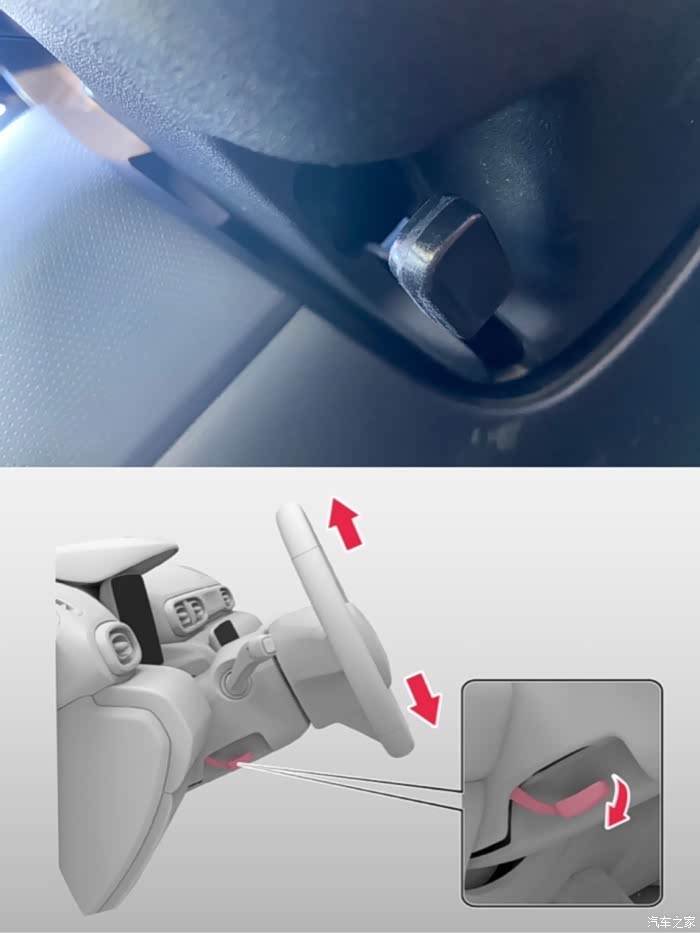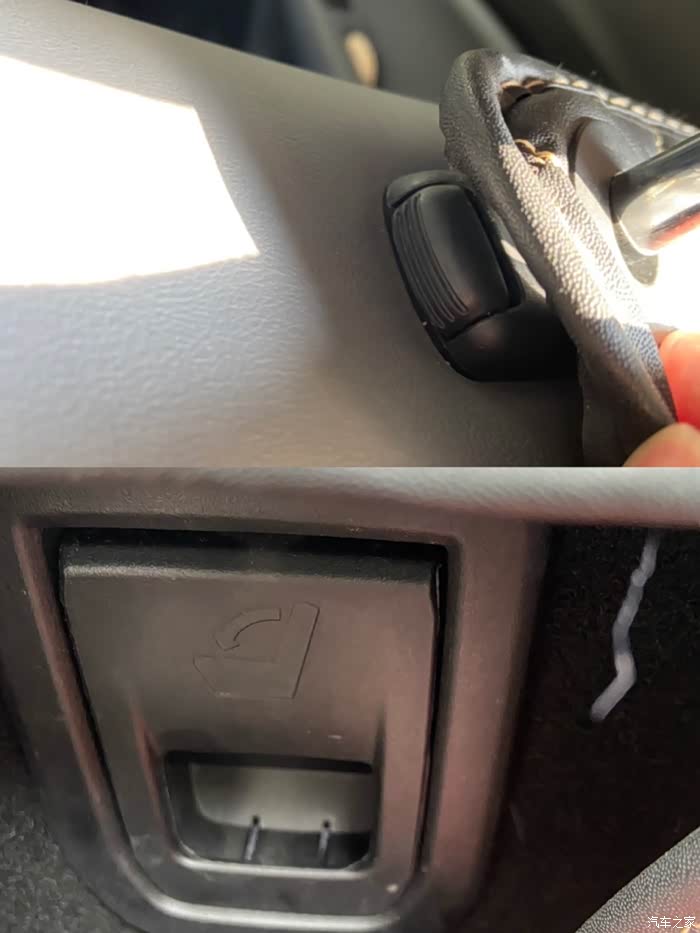 我们T03的方向盘有调节功能,方向盘的调节键位于方向盘下方,向下扳动方向盘调节手柄,可上下调整方向盘,直至达自己合适的位置,然后在向上扳动方向盘调节手柄,锁止方向盘。在上下移动下方向盘,确认方向盘是否牢固。