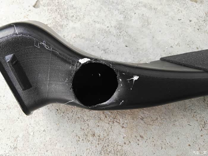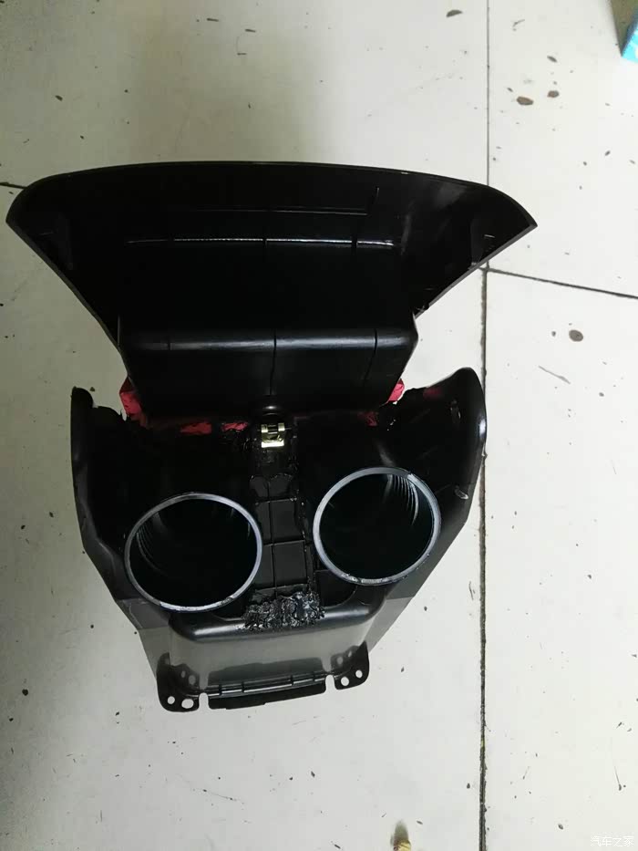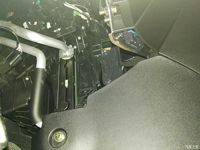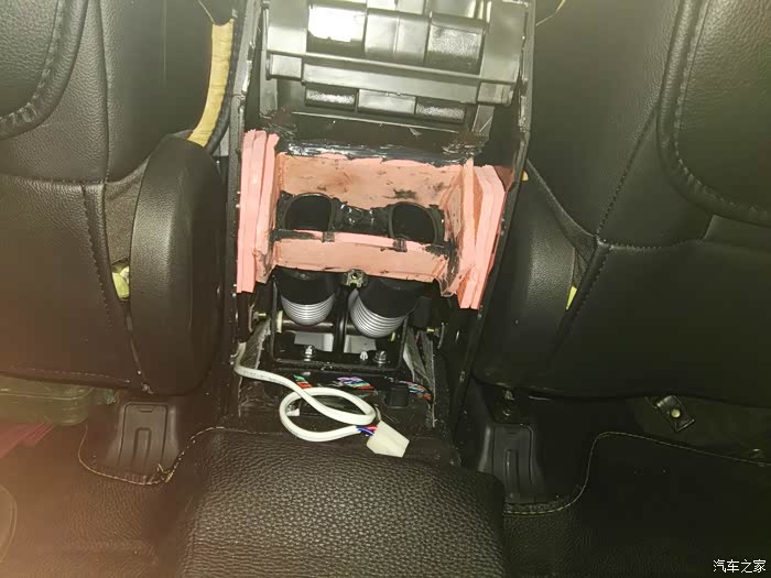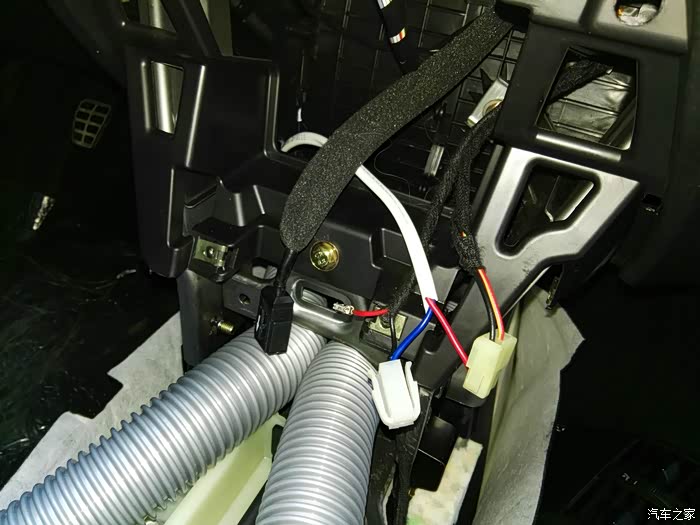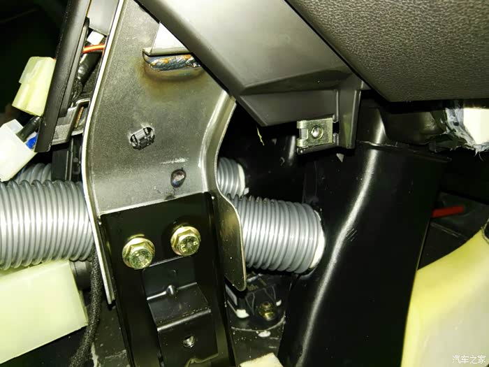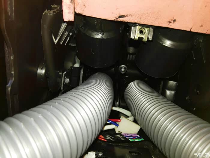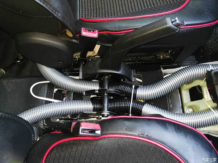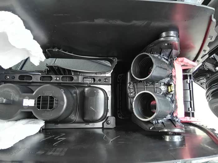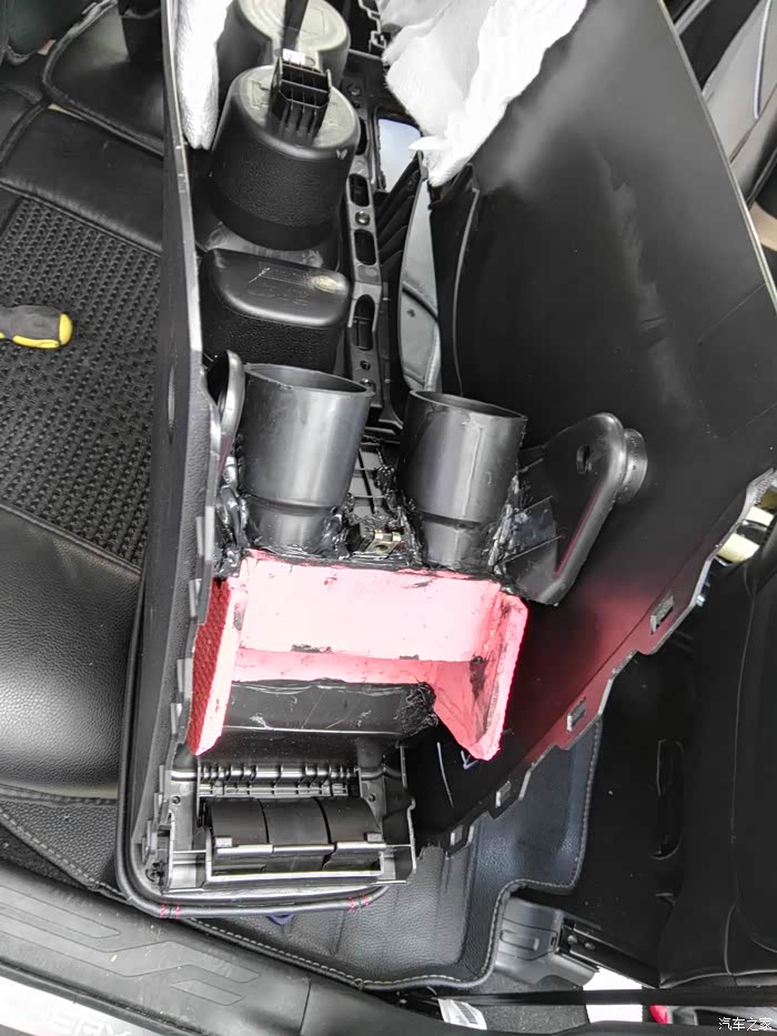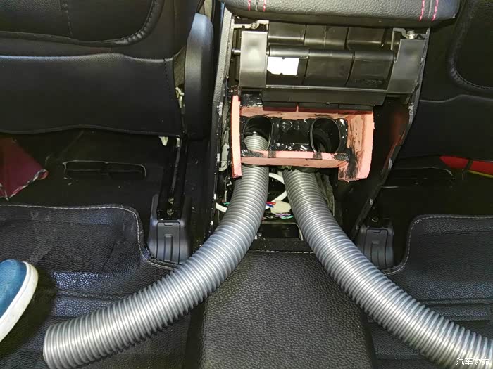 这是仪表台去前排座位下出风口管道,左右各一根,在这里开口,40mm电线管一节,穿进去缝隙密封胶密封,这里把座椅下风口全堵上,后排出风口风量会大些。