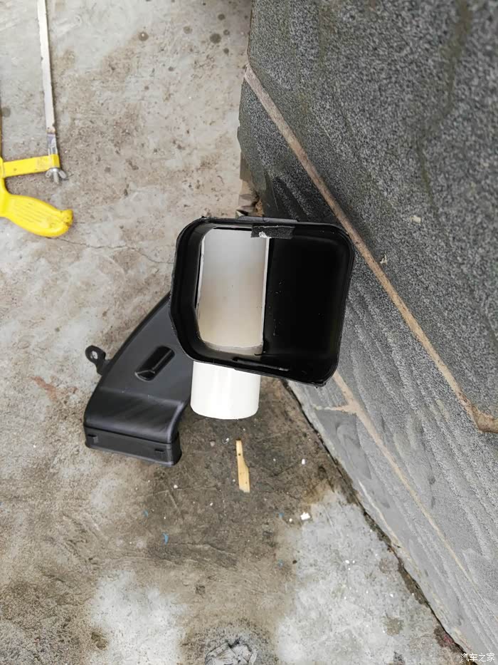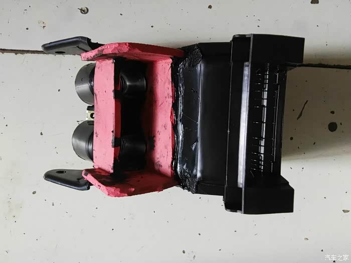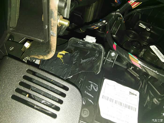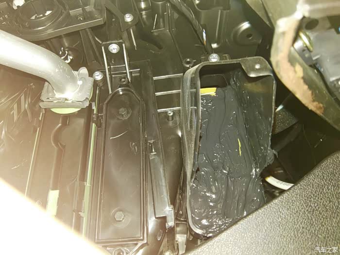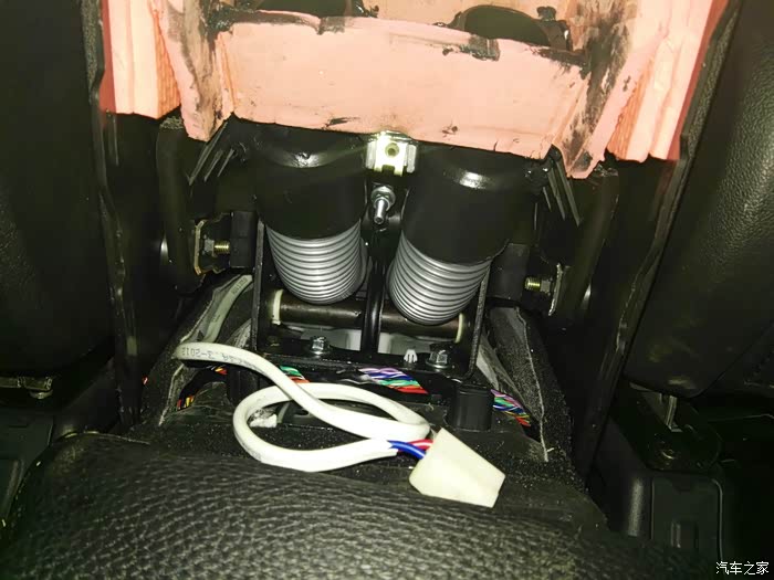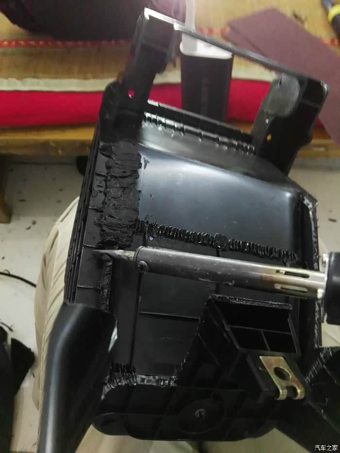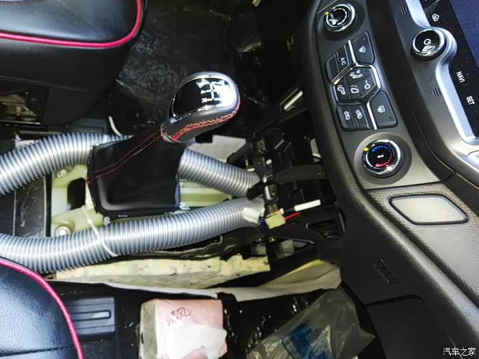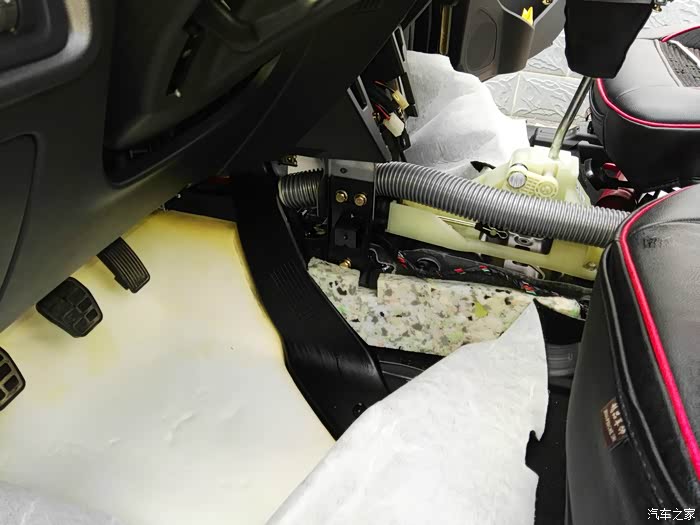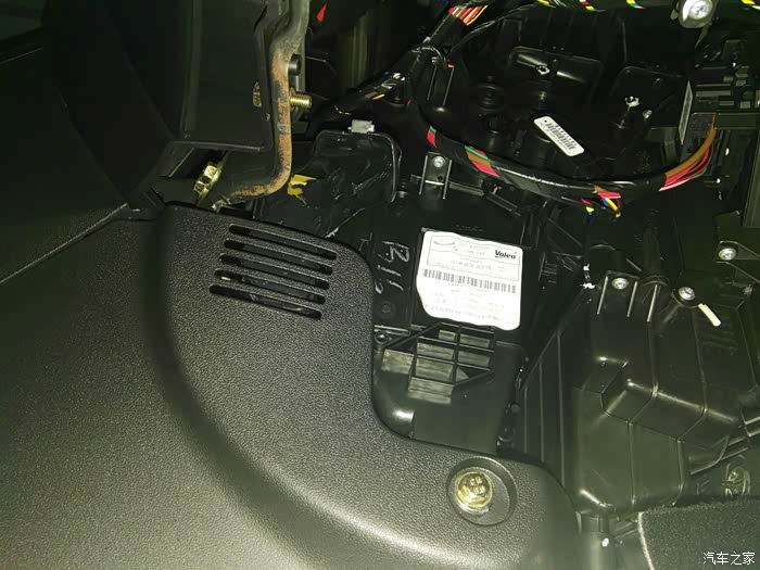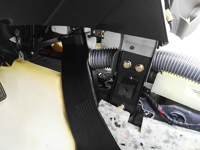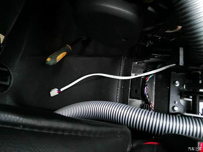 这是仪表台去前排座位下出风口管道,左右各一根,在这里开口,40mm电线管一节,穿进去缝隙密封胶密封,这里把座椅下风口全堵上,后排出风口风量会大些。