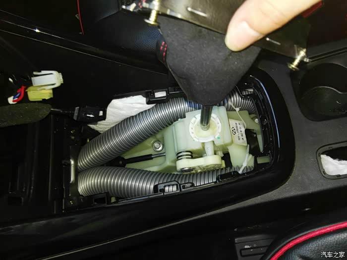 排挡装饰盖向上撬开,可以看到扶手箱连接仪表台2颗螺钉,之后还有拆了档把固定皮套的4颗螺钉拆掉,装饰盖翻过来就能看到。