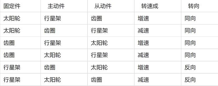 我们假设太阳轮、齿圈和行星架的转速分别为n1、n2和n3,齿数分别为Z1、Z2、Z3;齿圈与太阳轮的齿数比为α。根据能量守恒定律,我们可以推导出两个计算公式:n1+αn2-(1+α)n3=0 和Z1+Z2=Z3。由于单排行星齿轮机构具有两个自由度,在太阳轮、齿圈和行星架这三个基本构件中,任选两个分别作为主动件和从动件,而使另一元件固定不动(即使该元件转速为0),或使其运动受一定的约束(即该元件的转速为某定值),则机构只有一个自由度,整个轮系就可以按照一定的传动比传递动力,下表展示了行星齿轮机构各种运动情况: