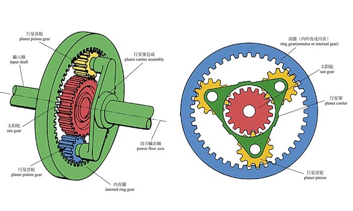 我们再来看看它的结构,以最简单的单排行星齿轮组来举例,它是由四个部分组成,中心红色的太阳轮、绿色的行星架、中间的黄色行星齿轮和最外圈的齿圈,由于内部的行星齿轮与绿色的行星架固定在一起,所以在太阳轮转动的同时,周围黄色的行星轮不仅能实现自转也能绕着太阳轮进行公转。行星齿轮组有一个特点,就是内部的齿轮处于常啮合的状态,不会出现因为打滑的状态,因此在行星齿轮组这个机构中我们认为它不存在动力损失。