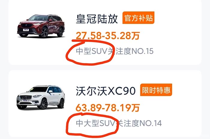 陆放和沃尔沃XC90尺寸一般大,但一个划为中型,一个划为中大型