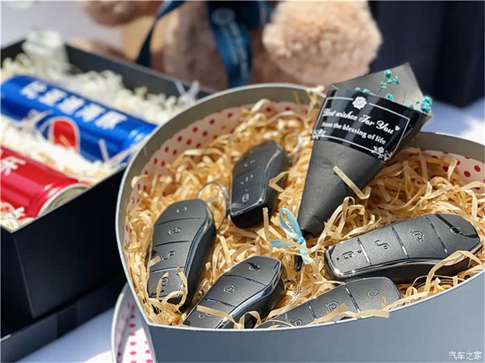 5把钥匙在一块,而且也做了一个精美的礼盒,不得不说比亚迪海豚的这个钥匙设计还是很有质感的