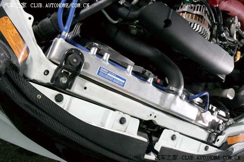 | 原本的上置式中冷器則改以HKS所推出的前置式取代,對於冷卻進氣溫度有著絕佳效果。 |