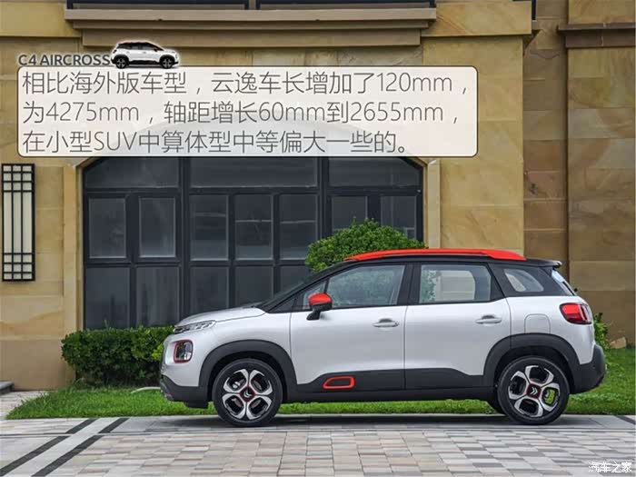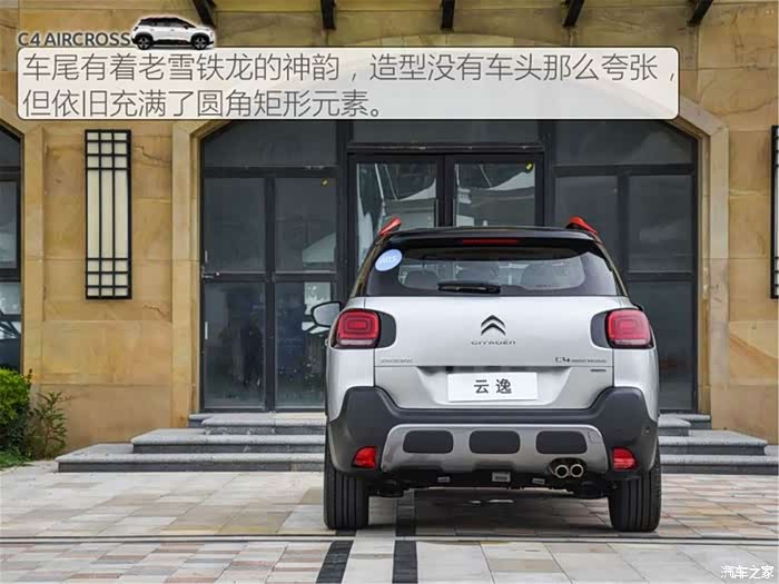 云逸 C4 AIRCROSS是雪铁龙C3 AIRCROSS的国产加长版本,其轴距相比后者加长了60mm。外观方面,新车基本沿用了海外C3 AIRCROSS车型的整体设计元素,其整体造型较为圆润个性。狭长的LED前大灯组与中央的镀铬格栅相连,增加了整车的视觉延展性,同时其前/后保险杠的设计也与概念车保持一致,包括黑色的底部护板、黑色轮眉等,兼顾了时尚感与SUV车型的运动感。