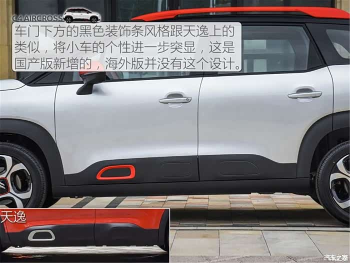 车身尾部,其整体设计相对简洁,不过细节上依旧充满了设计感。比如新车的尾灯采用红、黑双色搭配,内部回字形的灯组布局预计会有不错的点亮效果。而在底部,新车的后保险杠也与前保险杠相呼应。此外,国产版本相比海外版车型在细节方面进行了调整。例如,新车在车门侧面增加了与天逸 C5 AIRCROSS车型相似的银色环状装饰,并采用了新的尾标等。