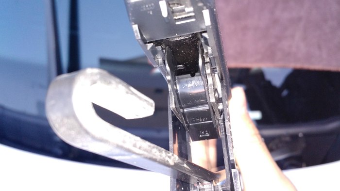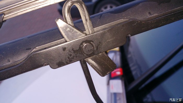 向里按住这个揪揪,然后将雨刷片向下使劲按,需要稍微大力一点,比较紧,请注意上边的卡子会顶到胶皮,稍微错开点位置,然后将雨刷片从U型接口上拿下来