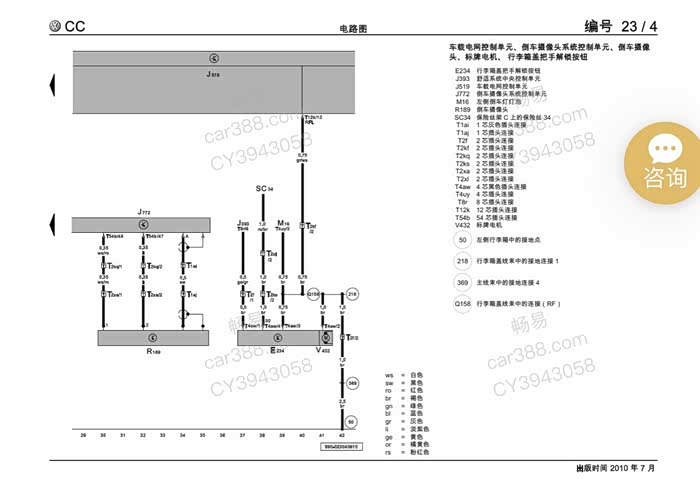 又到周末继续搞科研,翻标电路图和倒车灯电路图,看了无数遍,觉着真心欲哭无泪,不知道问题出在哪里,开始拿着测电笔负极搭铁到处测插头,结果测到原车尾箱盖的两线插头的时候,找到了问题,翻标四线插头1号接J393(中央舒适系统控制单元)说白了取电,2号接地,3号接M16(倒车灯正极),4号接SC34(34号保险,我的是cc,每辆车不一样),但是测电笔测试原车插头2号是J393,1号是接地,所以两线接头接反了(卖家给我发来的时候四转二接头的两线端没有X,是我自己X的),老规矩先飞线测试(因为退针很麻烦),着车挂倒挡,一切OK,太兴奋了,此刻心情,溢于言表,果断退针重新接,到此性感的小标就翻起来了。