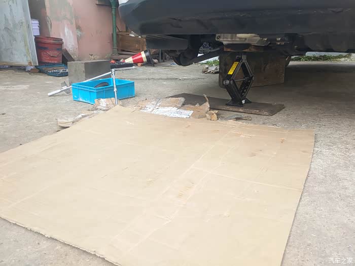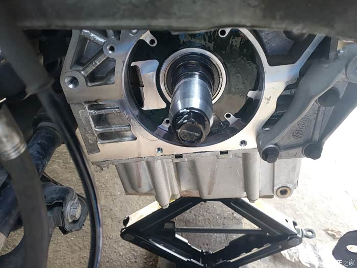 拆卸轮胎,以及发动机右侧护板,将车体支撑牢靠,用千斤顶轻轻顶住油底壳。