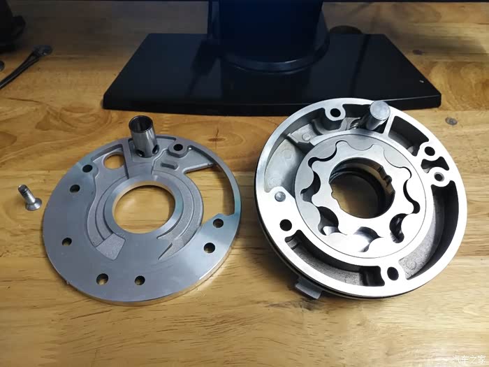 拆解的时候偷懒,拿内六角扳手去旋梅花螺丝了,结果有一颗螺丝拧花了,所以用钻头打掉了,左侧为盖板,右侧为泵体,内部中间为内外转子,上方圆柱形为泄压阀阀芯,左侧盖板上方圆柱为泄压阀阀体外壳。