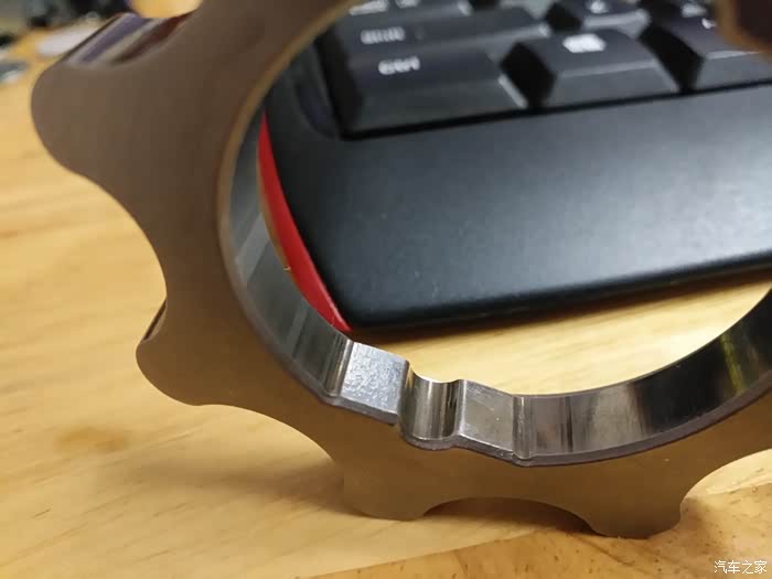 机油泵内转子与曲轴接触的平面,可以看出只有左侧单边接触,且接触面有很多敲击痕迹,必然会产生噪音,证明曲轴和机油泵内转子配合不合理,这里明显是间隙配合,我觉得应该采用过渡配合,但对整体加工精度要求会变得高一些。