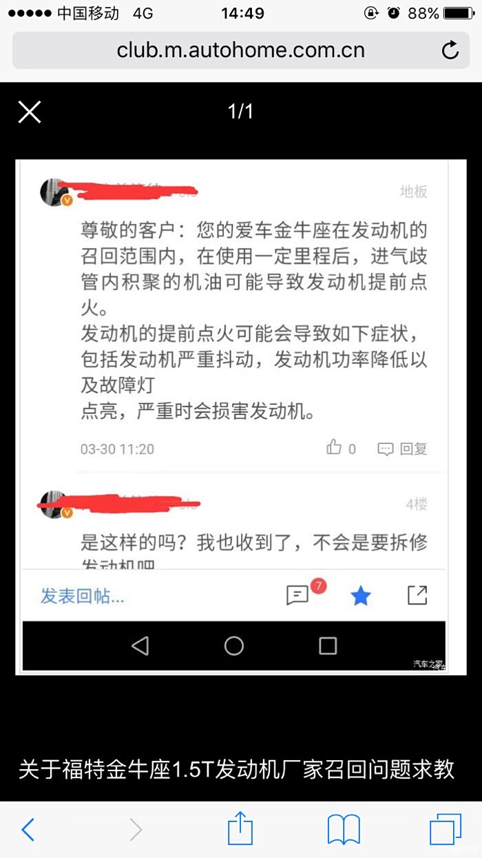 而厂家却偷偷内部召回(厂家把这种召回叫做车主关怀)使用同样1.5t发动机金牛座进行配件升级修理,却不给蒙迪欧、翼虎、福克斯1.5T车主车辆维修,这种暗中召回金牛座区别对待使我们其他车主很不能理解!!!