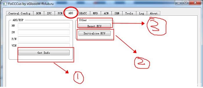 切换到ABS状态界面后。第一步,点击Get info;第二步点击Initialize ECU,ABS 灯会闪,等绿色进度条走到 100%表示成功;第三步点 Reset ECU(这一步点一下就行,进度条就是 0%,点完就直接关闭软件,不要等进度条) ,ABS 重置就结束了,屏幕故障也消失。