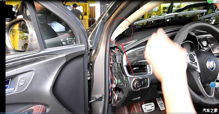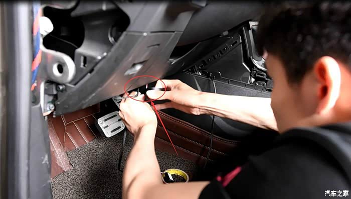 将左侧装饰板拆下来,这样从A柱顺下来的线就可以从图片6点钟方向的洞进去