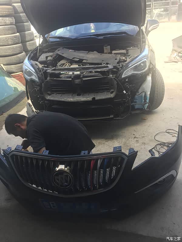 拆前杠,打孔,甲哥用的打孔器,没有毛边,因为之前的车是用电钻打的孔,甲哥有点心里不平衡,哈哈 原厂前保险杠预留位置,可以直接打孔