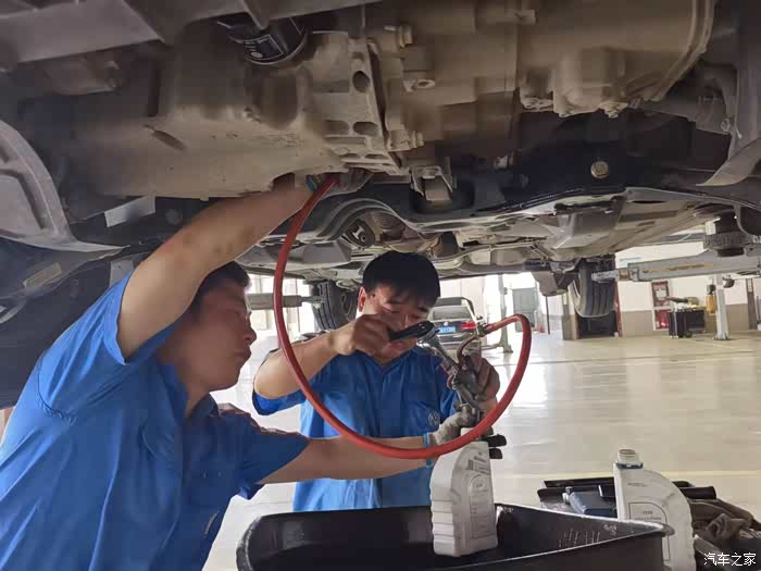 接着是注入换新油。用类似装修打胶的方法注入齿轮油,因为两边的油塞都没有拧上,一边注入、一会时间另一侧会有少量的齿轮油流出,师傅说这样可以比较干净地放完旧的齿轮油。2瓶齿轮油用不完。