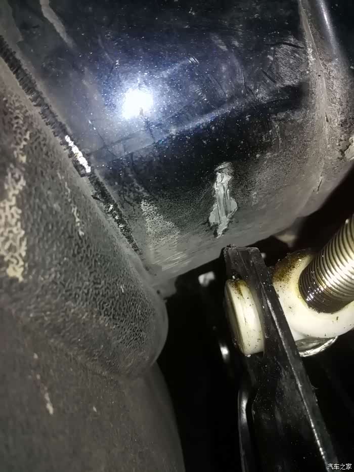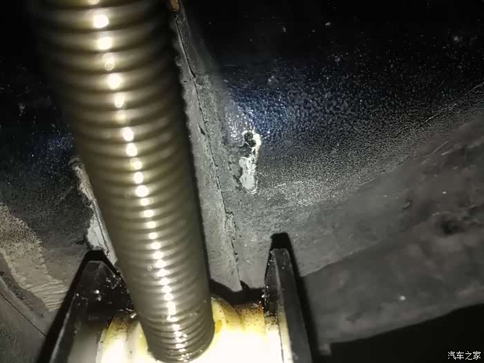 第一次不知道千斤顶放哪里,就放到轮胎后靠外,看网上说要放到靠内侧像鱼鳍一样的钢板上,但根据以前经验,单片薄钢板竖向一顶很容易歪一边去。没想到刚开始没事,开始受力的时候,就听到崩崩两声,一看车底外缘崩裂了,梁也往上凹进了一块约2公分高,10多公分长,心那个痛啊