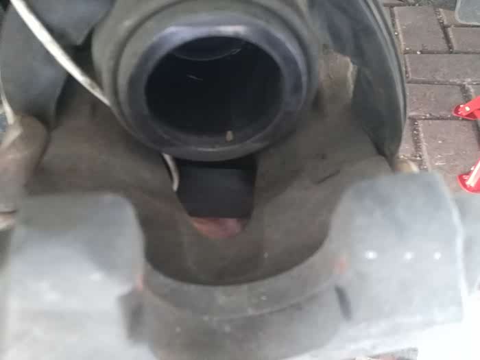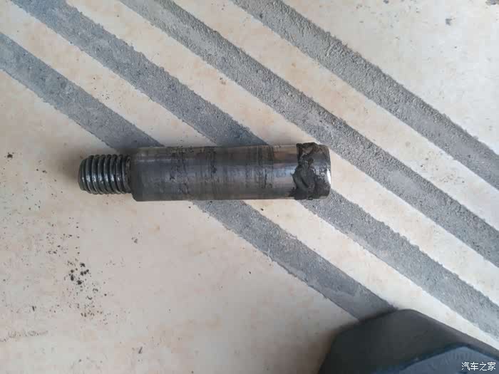 导向销(中间那个)是带帽子的,我想把它扯下来,怎么也扯不动,如用工具拉,肯定废了。最后决定不动它,看里面的螺丝是怎么样的。我的怎么看不见螺丝头,究竟什么螺丝都不知道,只能看见发亮杆身。记得人家的是螺丝外露,胶套在中间。只好用手摸,和拍照看,拍了几次也看不清楚。最后头伸进去看,大概可以看见是六角螺母或者星型螺丝,这时安全支架作用可大了,万一千斤顶掉了,小命就没了,上有老 下有小啊。