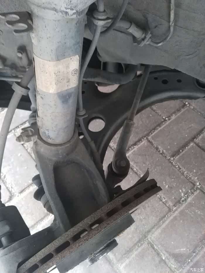 ,赶快放下来,换内侧顶,边顶边趴下车底观察,这下没事了。旁边加上安全支架,再放下点千斤顶让支架受力,轮胎可以转动,高度刚好。 松完所有螺丝,就取下轮胎,死沉的,绝对超过50斤,塞到车底下,三重保险。