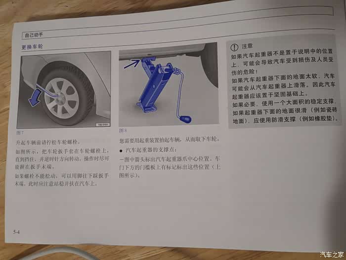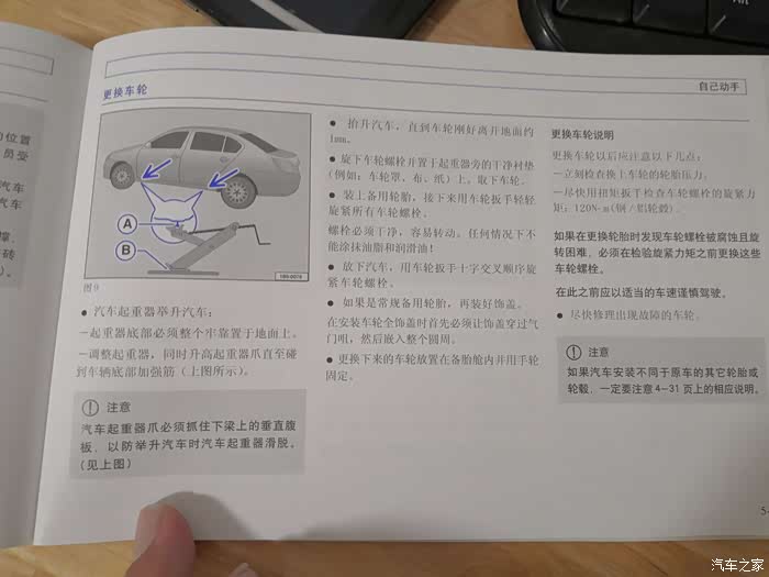 回到家找出朗逸行车说明书温习,自己动手更换轮胎部分,里面是说明架在腹筋竖板上,旁边底板上有个橡胶圈提示架千斤顶位置,即说明我第二张示意图架在内侧是对的,保养前功课做的不够