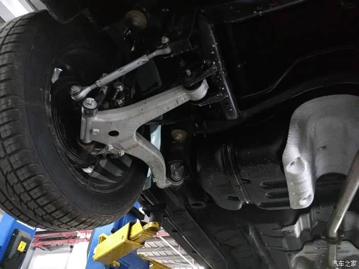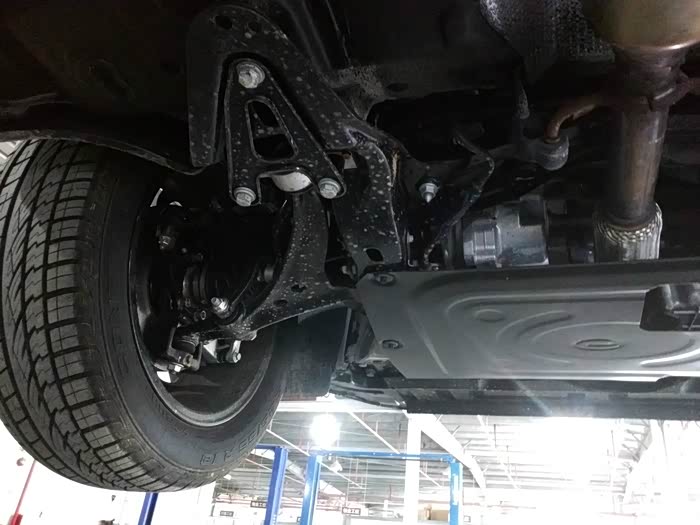 把车子升了起来,我要看看底盘;从侧面看前悬,那是铝合金的悬挂组件么?