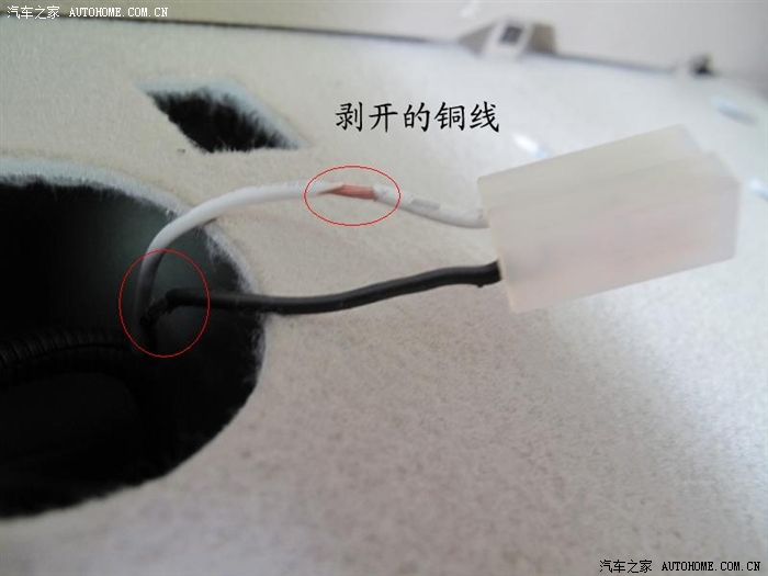 把点烟器的电源线小心剥开,错位剥开,千万别把铜线搞断了,效果如下: