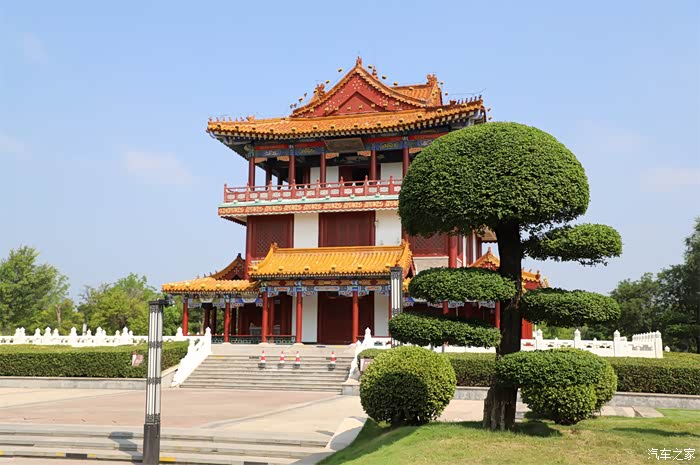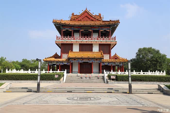 北湖阁高17.77米,采用十字脊屋顶设计,飞檐翘角覆以琉璃瓦,兼具唐代建筑的大气与宋代建筑的精致。本想登临北湖阁欣赏景区美景,奈何阁楼大门紧闭无法进入,非常令人遗憾。