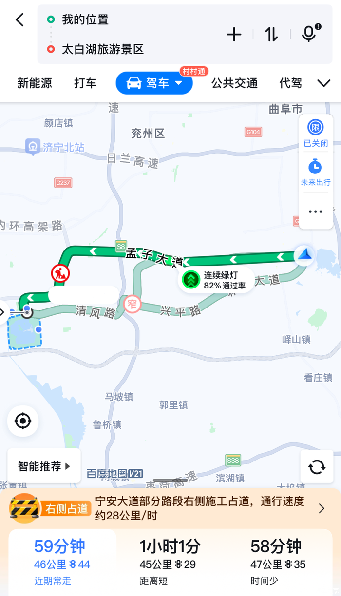 本次的自驾路线是家——太白湖旅游景区——家,行程时间为1天,总路程95km。