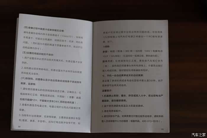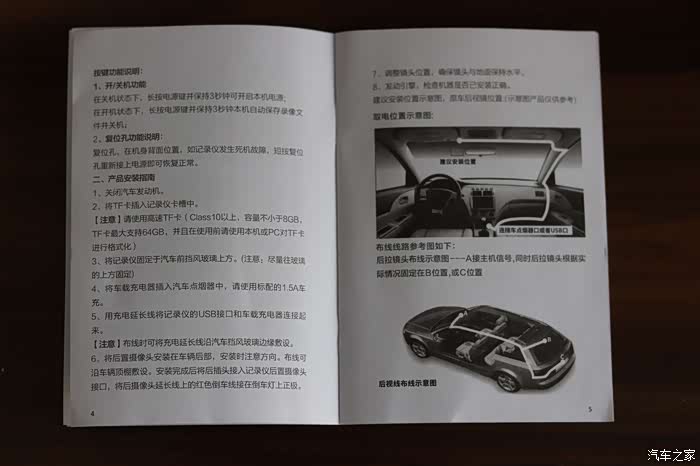 安装方法非常的简单,前镜头连接到点烟器,后镜头安装车辆后部,红色倒车线接在倒车灯正极,可以实现倒车影像