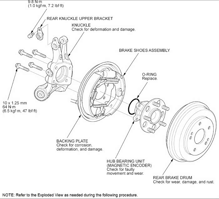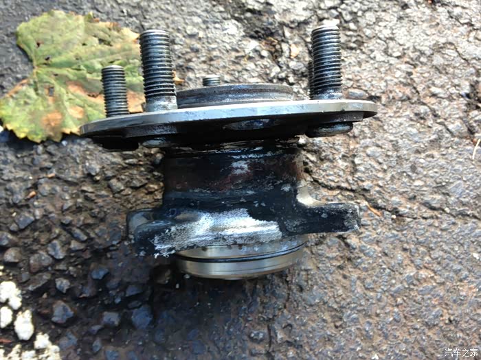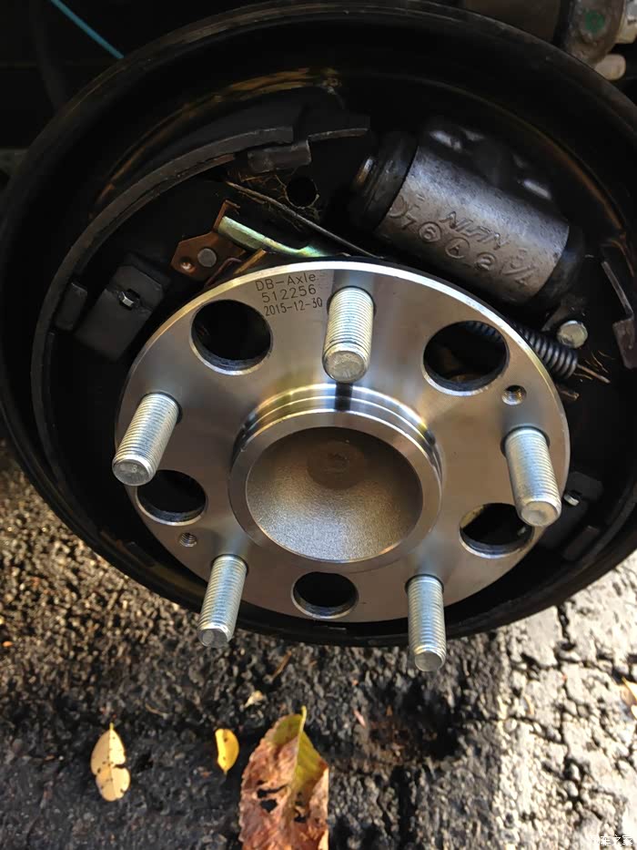 后轴比较好换,对于我的车子就取下车轮,取下刹车鼓,拧四个螺丝。之后取下原轴承,换上新的就可以了。对于国内后边是盘式刹车的朋友,需要先取下卡钳和卡钳支架,取下刹车盘,之后的工序是一样的。关于四个螺丝扭矩,下图中有,不过因为空间狭小,扭矩扳手耍不开,所以我就只好按经验用手劲拧紧了。卸下来的旧轴,我用手转动时候明显听到摩擦声,新的转起来就很安静。