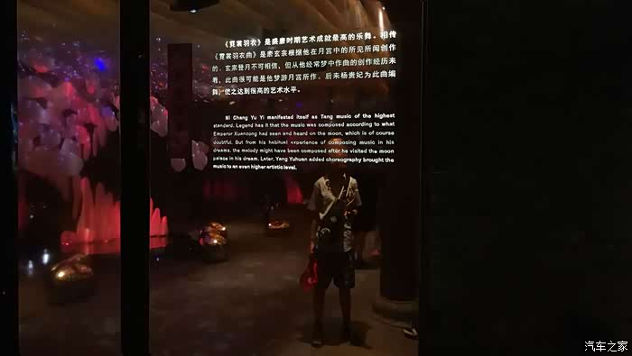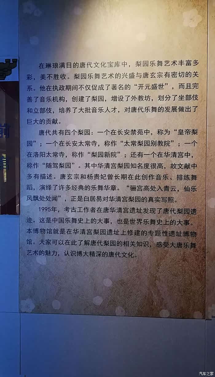 坐上电瓶车来到景区出口处,朦胧中好像看到梨园展区,忙问师傅,师傅说,那里不要去,全部都是做买卖的。你要看梨园就到那边那个博物馆里去。下车来到博物馆门口,咦,门前冷落车马稀呢。管他呢,既然开车的师傅说是这里,就走进去看看啦。进去一看,果然非同凡响。正宗的梨园博物馆。里面的一面电视墙上正放着《霓裳羽衣舞》,不由得想起白居易的诗句”风吹仙袂飘飖举,犹似霓裳羽衣舞。……玉容寂寞泪阑干,梨花一枝春带雨。在天愿作比翼鸟,在地愿为连理枝。……天长地久有时尽,此恨绵绵无绝期。”很多人都只知道杨贵妃的美貌,不知道杨贵妃的才华。相传,李隆基曾经梦见游月宫时,听到天上有仙乐奏曲,身穿霓赏羽衣的仙子翩翩起舞。仙女的歌声玄妙优美,跳舞的仙女舞姿翩翩。李隆基醒来后,对梦中的情景还记得清清楚楚。很想把梦中的乐曲记录下来,让乐工演奏,让歌女们舞蹈。有一次,李隆基来到三乡译,他向着远远的女儿山眺望,山峦起伏,烟云缭绕。顿时产生了许多美丽的幻想。他把在梦中听到的仙乐全想起来了。立即在谱子上记录下来。创作了一部适合在宫廷演奏的大曲。李隆基命令乐工排练《霓赏羽衣舞》,令爱妃杨玉环设计舞蹈,为了让他们有个好场所排练,李隆基在宫廷中建立了一个梨园。杨玉环与宫人日夜赶排。终于,练好了一大型歌舞《霓赏羽衣曲舞》,在一个盛大的节日上演出,所以,《霓衫羽衣舞》和杨玉环有关。可以说霓衫羽衣舞因她而出名。杨贵妃的能歌善舞也是吸引皇上的重要因素哦,光凭美貌,呵呵了。在里面我还看到一个奇女子,她独自一人坐在一副壁画的跟前,手舞足蹈,一会哭一会笑。本来想拍一张照,但是想想这是对痴情于梨园的弟子不尊重,就罢了。不论什么事物,只要沉浸进去,疯魔是一定的。