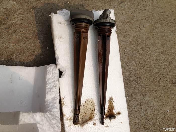 我的做法是旋出机油标尺,观察上面附着的颜色轻重。请仔细看AB这两部车的油标尺。(左侧的是A车的)平时注意保养的车子,内部油泥少,积碳轻。