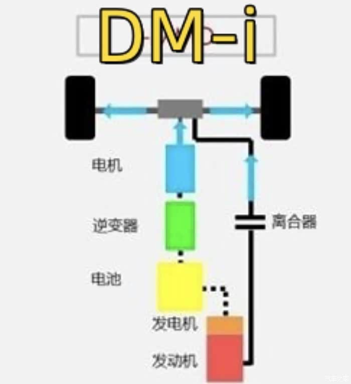 DMi技术代表某迪,这个技术是在变速箱做文章。DMi技术同时存在两种驱动方式。第一种:发动机驱动发电机,发电机给电池充电,电池驱动电机,电机通过变速箱驱动汽车行驶。第二种,发动机通过变速箱直接驱动汽车。