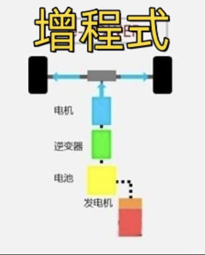3.重点来了,我们来看看增程,增程系统是发动机驱动发电机,发电机给电池充电,电池驱动电动机,然后电机直驱。