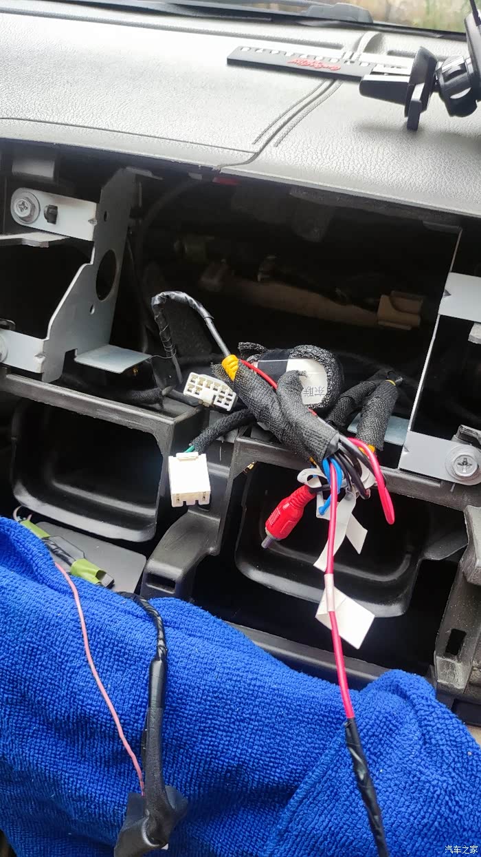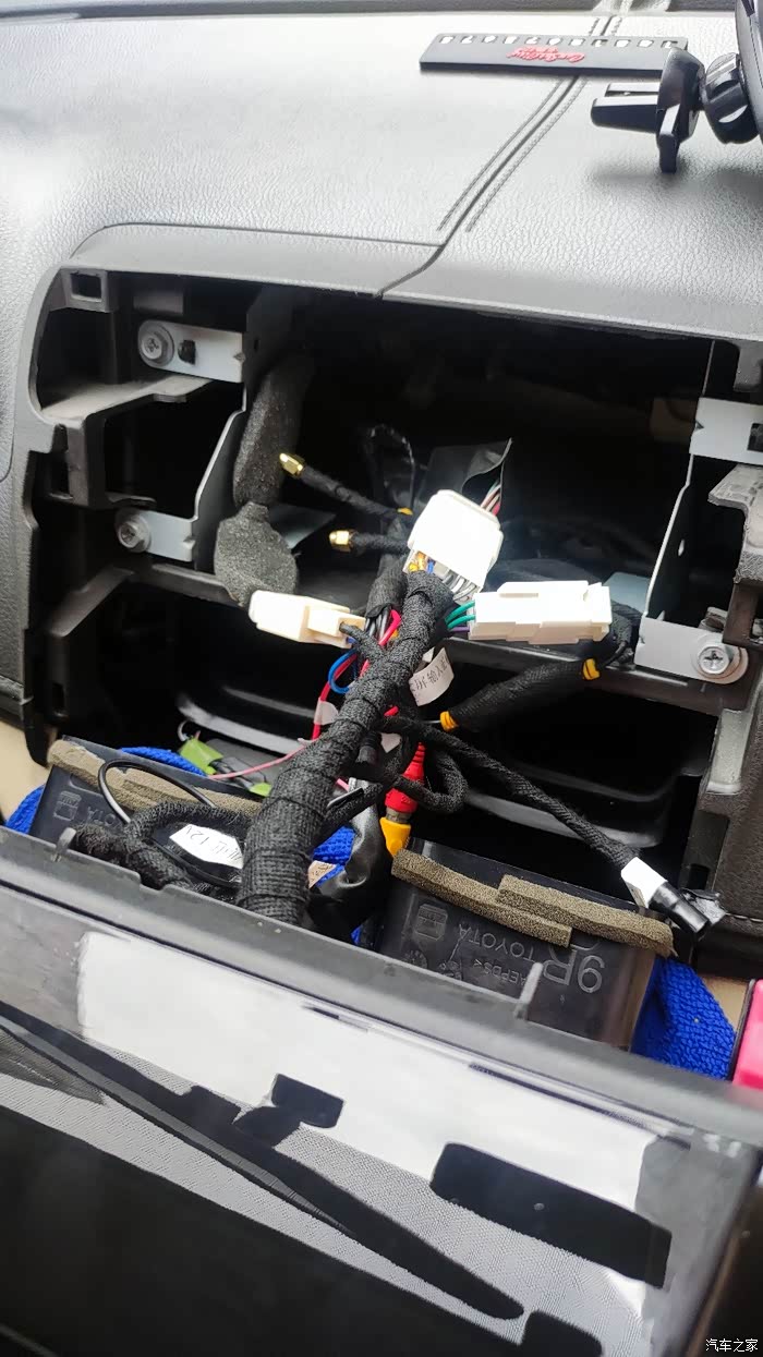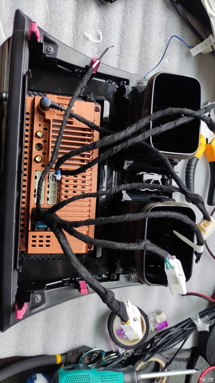 然后想着尾线要怎么搞,买又得花不少钱!最后想利用凯美瑞B导航自带的尾线,多的线剪掉,少的自己接着做,它带的协议盒对我们没用,拆了不用!其实尾线也就个电源插座,接个倒车可视线(接倒车可视)、USB数据线(插U盘听歌,连手机、电脑),把倒车检测线找出来,然后没了,够简单的!你有方控就接下方控线!这个B导航没有手刹解除线,直接是在系统里面关掉!