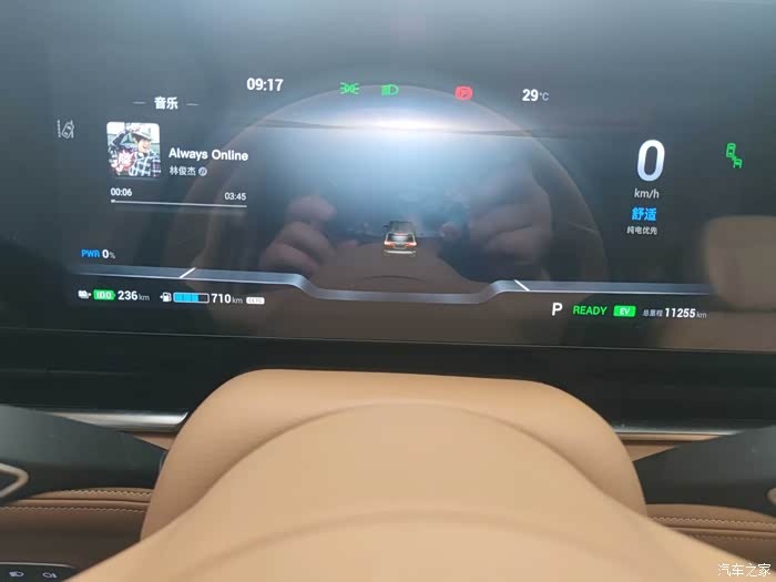 准备要出去玩,那就晚上提前充满电,CLTC吹拉弹唱的满电续航又显示到了236KM。纯电优先,舒适模式,准备出发。