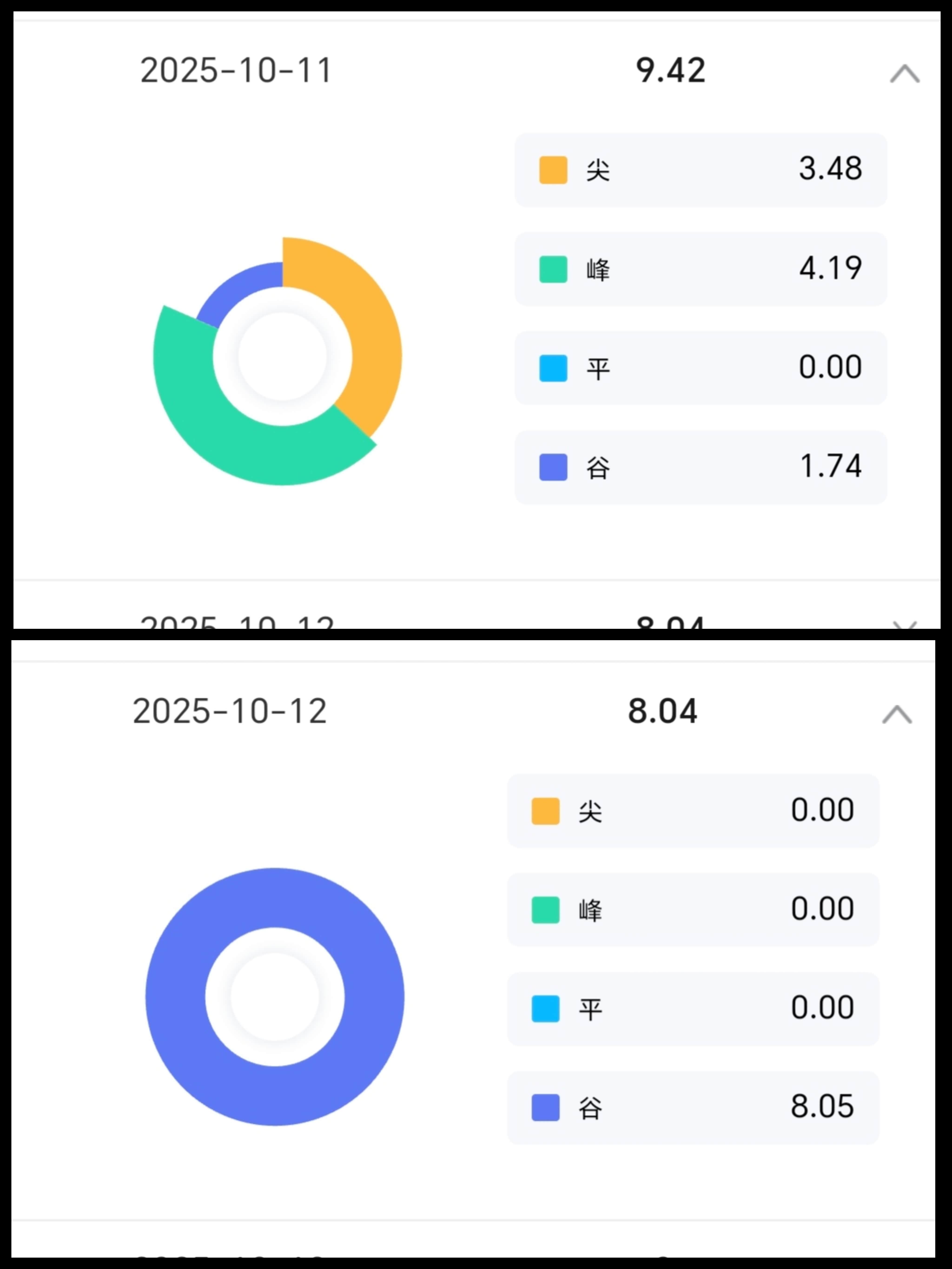 因为我是家充有专用充电电表,相比外面还是节省不少电费的。用我10月11日和12日的充电费用做计算。