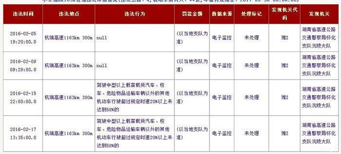 更郁闷的是四次违章都是在同一个地方,怎么都觉得不对劲,高速我一般不会超120,都是定速巡航开启的。仔细看了下:杭瑞高速1163km 300m:这个地方不知道为什么限速,既不是急弯道,也不是隧道,而且车辆很少,**是不是本地的交警队为了抓收入啊,问了朋友过年期间跑了起码10个来回,都是110的速度,也没有查询到违章,我的怎么就这么多违章,不明白??另外有没有朋友知道违章后手机立马提醒怎么开启?郁闷郁闷郁闷~~这么多扣分,要什么时候才能消掉啊~~~5555555555