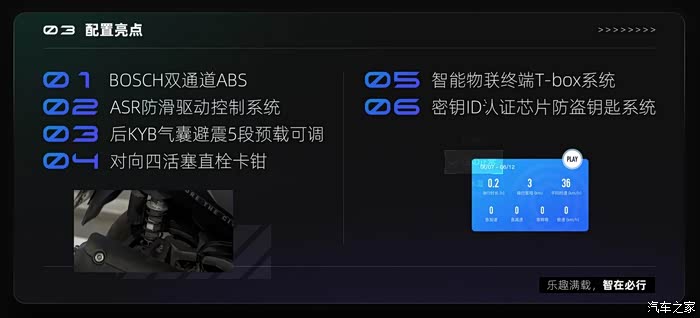 探索版在配置、动力等均与2.0高功率版保持一致,这一配置在基础版上主要有五方面的升级:后减震升级为可调气囊后减震,在过滤颠簸以及坑洼时能够带来更好的体验;BOSCH双通道ABS与ASR,在安全性上得到保障;芯片防盗钥匙,密钥ID智能识别,更方便更安全;智能物联终端T-BOX系统,实时侦测车辆信息数据,追踪实时轨迹,了解车辆信息更轻松;高功率引擎,动力相比基础版更强且油耗更低。