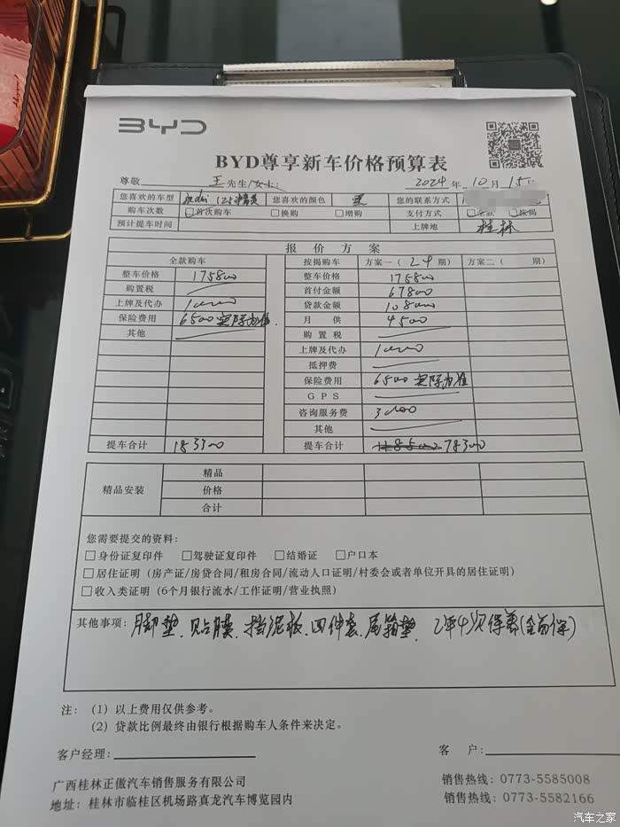 今天跟朋友来看25款的汉他们销售小姐姐给的价格方案。给的第一种方案全款就是整车价格+上牌+保险大概183300可以落地了。第二种方案是贷款。。。