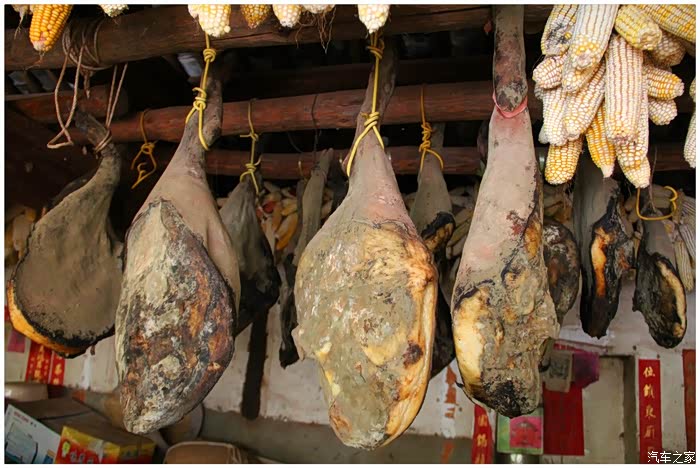 走进了农户的家里,房梁上挂满了发了霉的火腿。这就是舌尖上的中国里面被手一拍霉烟四起的火腿。