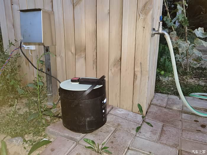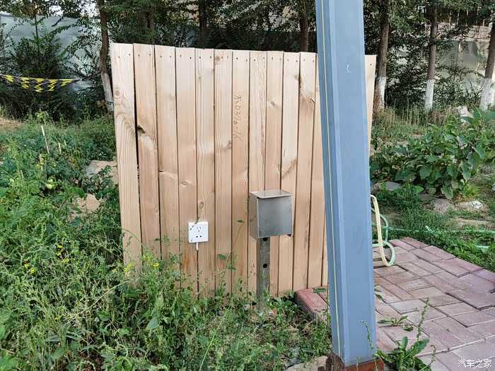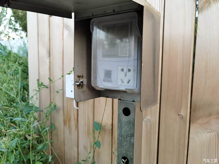 这里有一根水管,这个水管是用来浇后面的菜地的水用的,我驻车在这里的生活用水也是在这里取用,真的挺方便的,这里还树立着一个电表箱,但是经过我的实测这个箱子里是没有电的,扫二维码也是不能用的,李哥在旁边单独设计了一个插座,直接插上就有电,直接就能用。