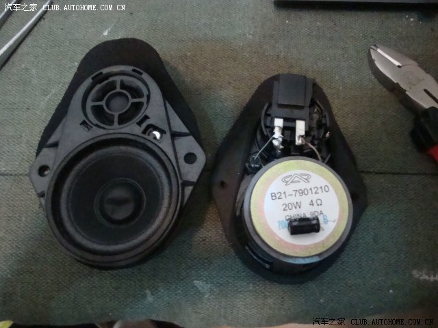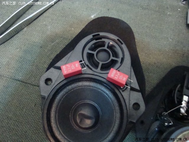 下面的这个是拆下来准备改电容的高音,可是没想到的是,原来是两个(中音和高音)有点不相信,以为那个小的是装饰,用万用表测后,是真的。厂家的资料上说全车8喇叭,大家只找到了6个,所以说他们的广告有虚假之嫌,其实是错怪人家了。因为它们是组合在一起的。正好是8个。