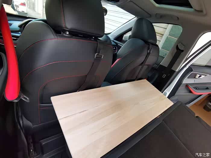 后排是用自己制作的后备箱垫板来当床板,下面用小木棍做支脚,然后上面横着放两根方料,一般人的体重这样足够支撑了。下面整个垫高的高度是12公分。后备箱的垫板是自己用木板重新做的,至所以要自己重新制作,是为了不想破坏原车垫板,因为垫板做床板与前面齐平后,后端两边会卡在车框边沿,那样垫板放不平。