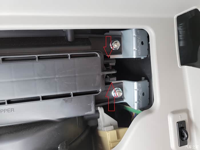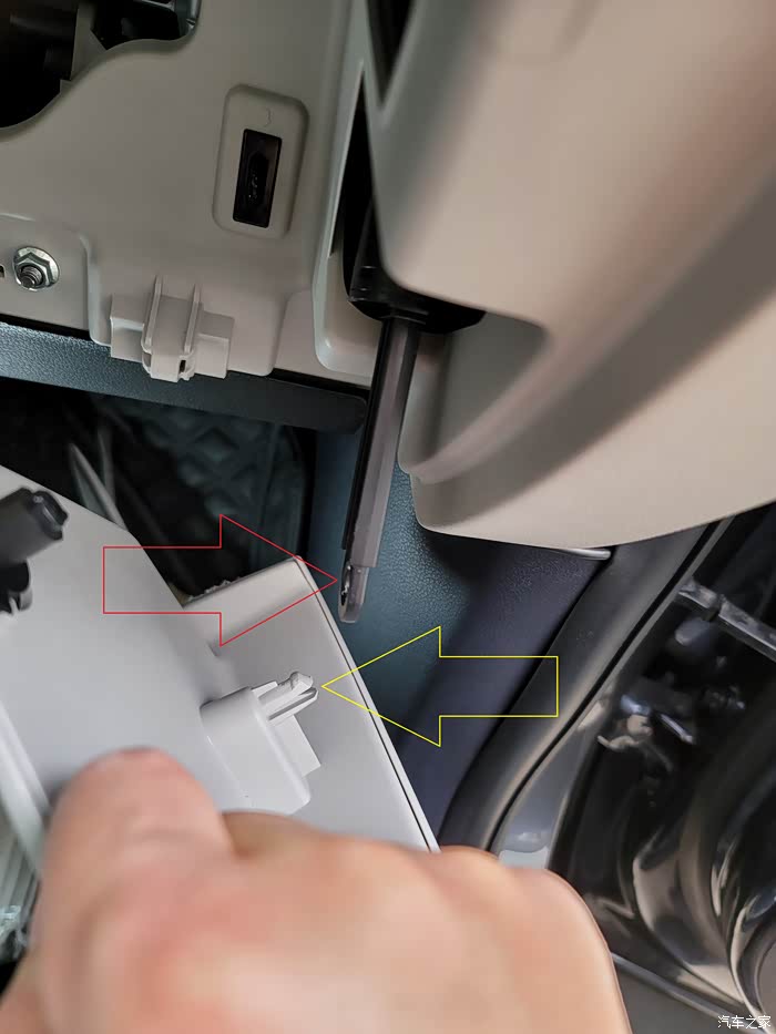 第二步,这时候只要拉开关,手套箱就掉下来了,注意事项,注意!红色箭头是缓冲块,用来让手套箱慢慢落下,显得比较高级。黄色是缓冲块的安装点,徒手可拆,就是手疼,推荐用扁螺丝刀插进缝隙一拧就拆下来了。